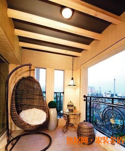 4、阳台有很多种吊顶的方法。比如是做葡萄架吊顶、彩绘玻璃吊顶、装饰假梁等等。如果家中的阳台面积不大的时候,小编建议不做吊顶,免得使整个空间出现一种压迫感。