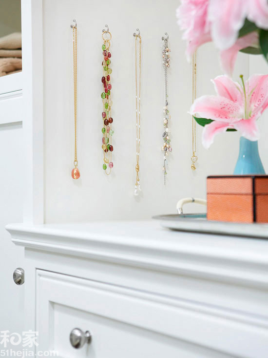一般家庭的女主人都有很多闲置的小玩意,不妨把这些小玩意儿用简单的挂钩,安置在墙壁上。绚丽的珠宝会让墙边变得精巧耐看。